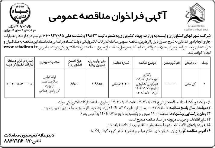 آگهی فراخوان مناقصه عمومی واگذاری امور خدماتی شرکت شهرک های کشاورزی