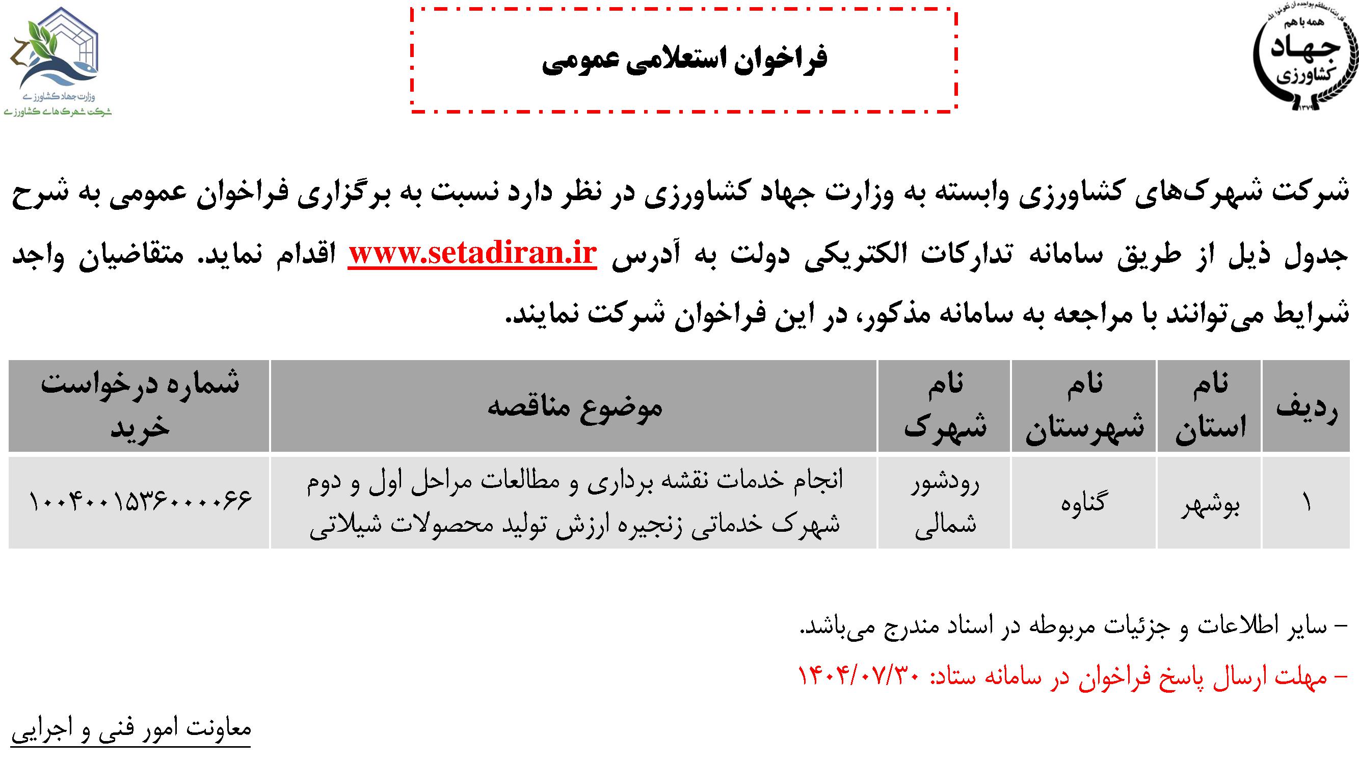فراخوان استعلامی عمومی انجام خدمات نقشه برداری و مطالعات مراحل اول و دوم شهرک خدماتی زنجیره ارزش تولید محصولات شیلاتی شهرک رودشور شمالی شهرستان گناوه استان بوشهر