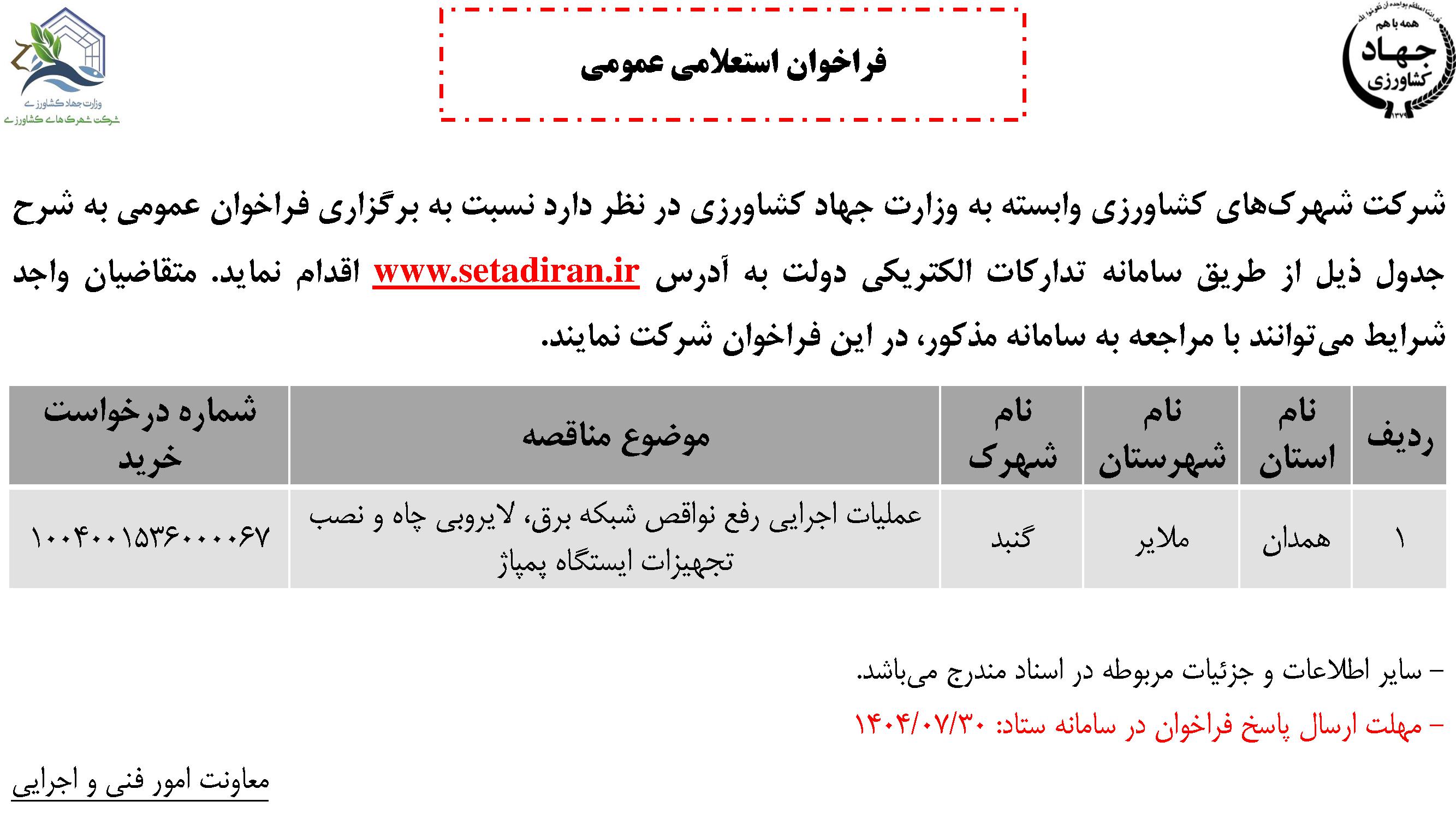 فراخوان استعلامی عمومی عملیات اجرایی رفع نواقص شبکه لایروبی چاه و نصب تجهیزات ایستگاه پمپاژ شهرک گلخانه ای شهرستان ملایر استان همدان