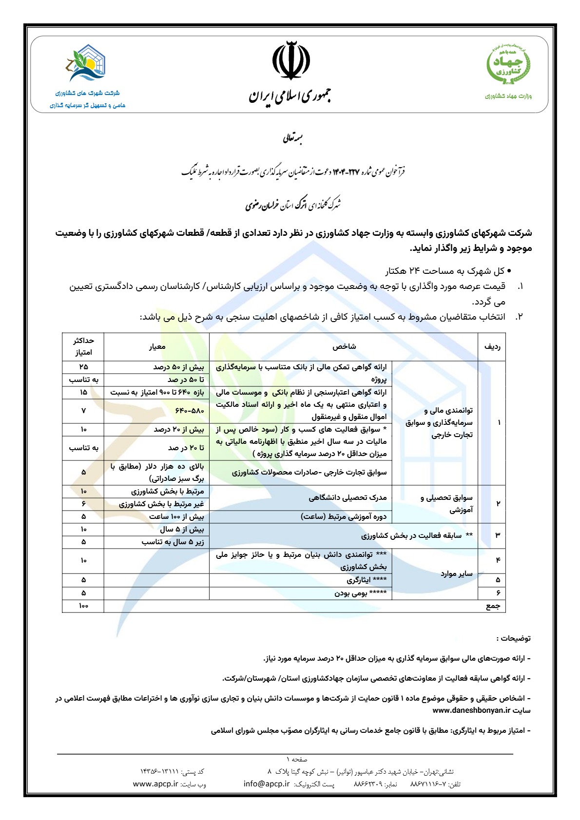 فراخوان عمومی شماره 227-1404 دعوت از متقاضیان سرمایه گذاری بصورت قرارداد اجاره به شرط تملیک شهرک گلخانهای اترک استان خراسان رضوی
