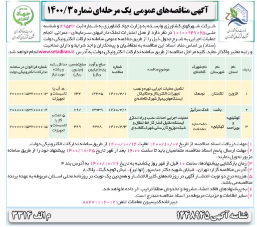 آگهی مناقصههای عمومی یک مرحلهای شماره 1400/3