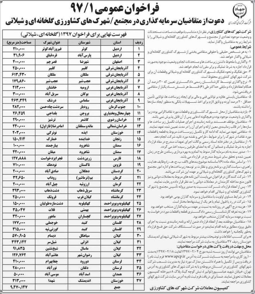فرآخوان عمومی ۹۷/۱ دعوت از متقاضیان سرمایه گذاری در مجتمع/شهرک های کشاورزی گلخانه ای و شیلاتی