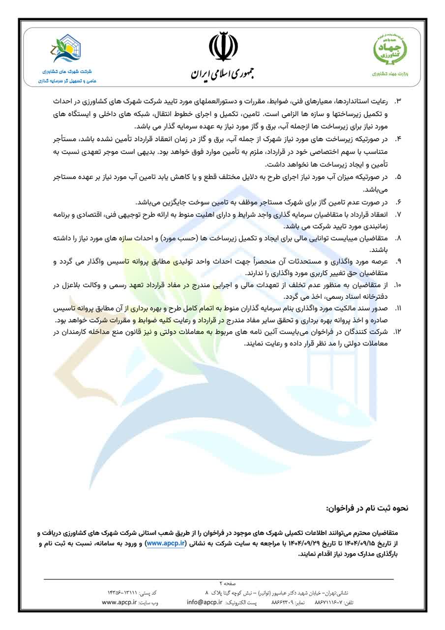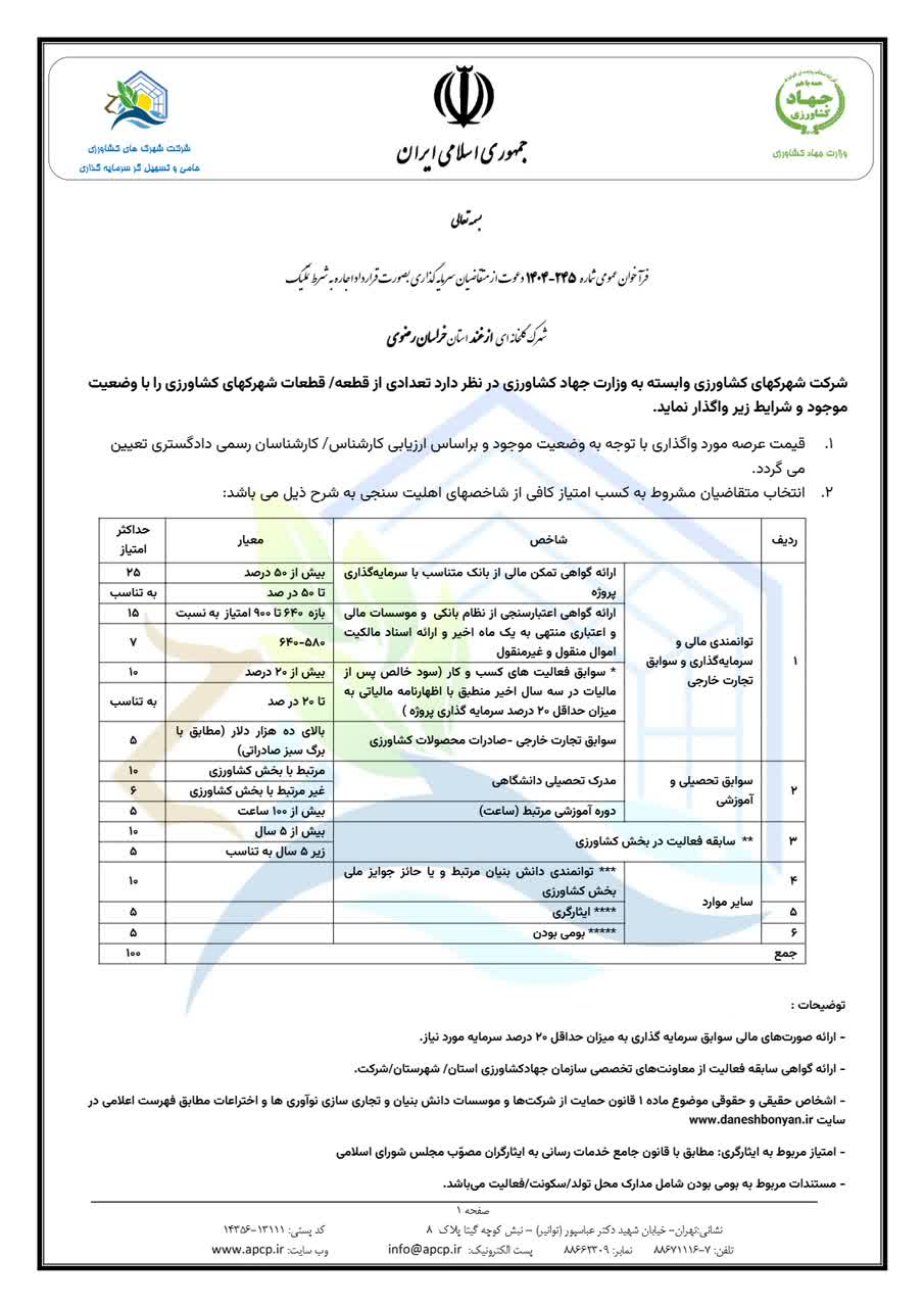 فراخوان عمومی شماره 245-1404 دعوت از متقاضیان سرمایه گذاری بصورت قرارداد اجاره به شرط تملیک شهرک گلخانه ای ازغند استان خراسان رضوی